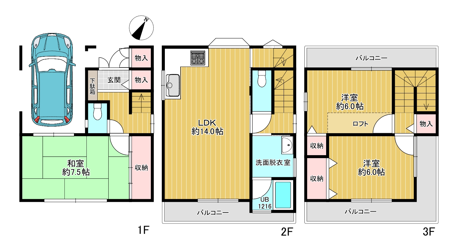 • 【3LDKの間取り】家族の成長や暮らし方に合わせてお使いいただける3階建3LDKの間取りです。
