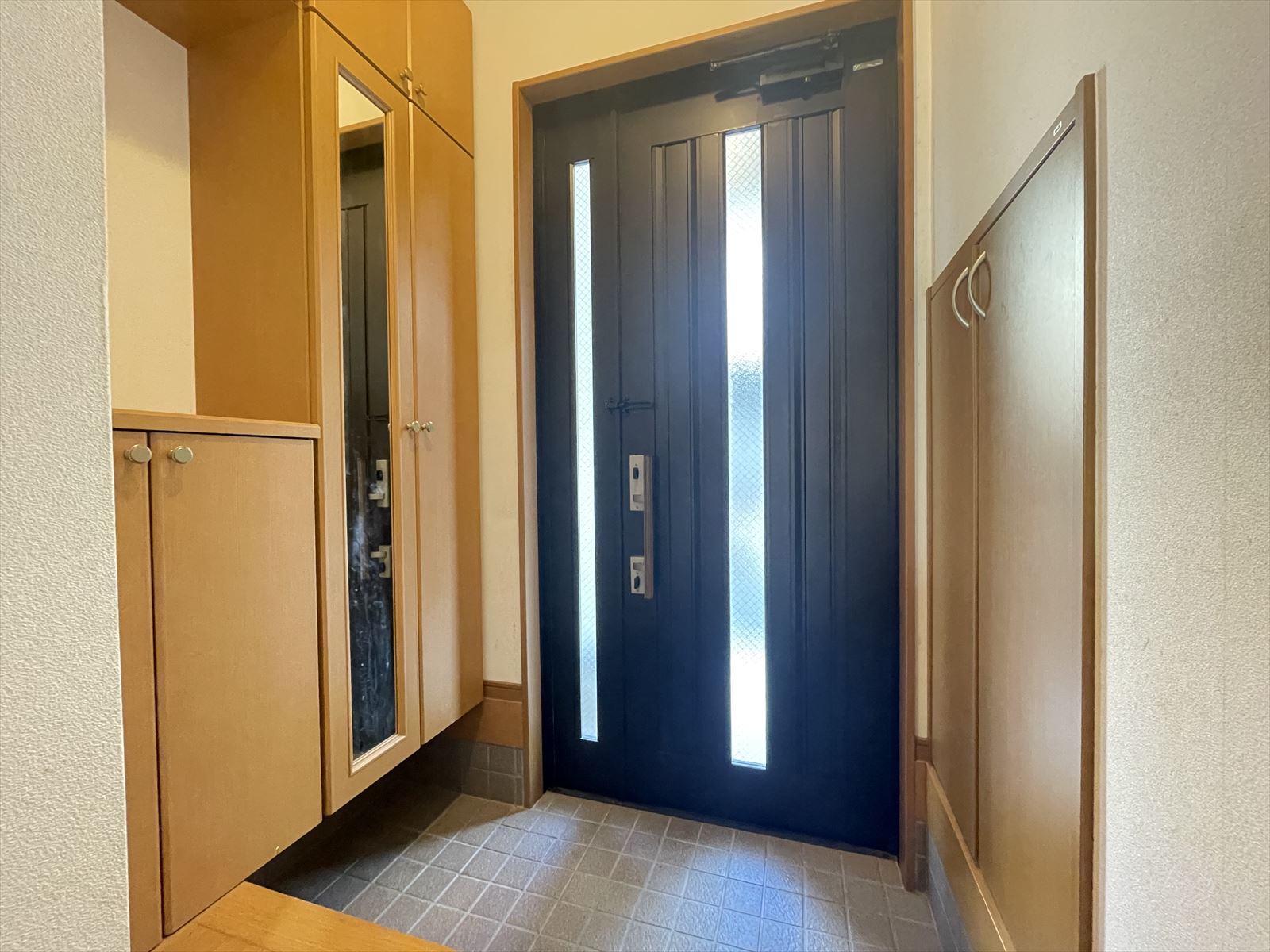 • 【玄関】壁面に玄関収納があり、収納力もも台なく、ご家族が多い方でもしっかりと収納いただけます。
