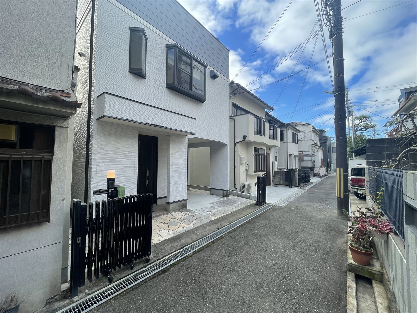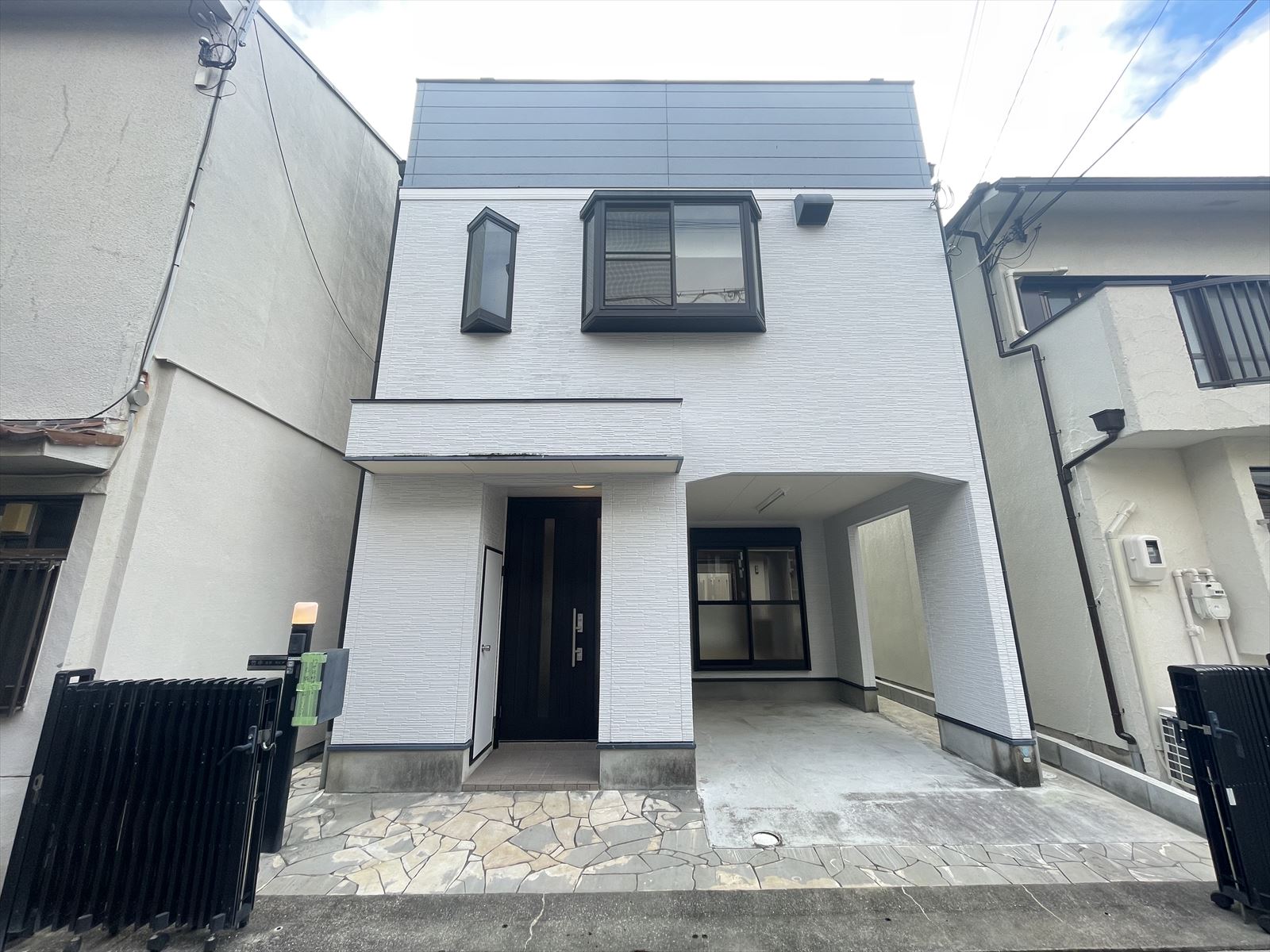 • 【現地外観】グレー基調の落ち着いた雰囲気の外壁となっております。カーゲートを撤去すれば、駐車もよりしやすくなります。