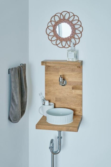 たとえばこちらでは、寝室の壁面スペースに洗面台を設置し、寝る前のスキンケアや朝の準備がその場で完結できるようにしました。